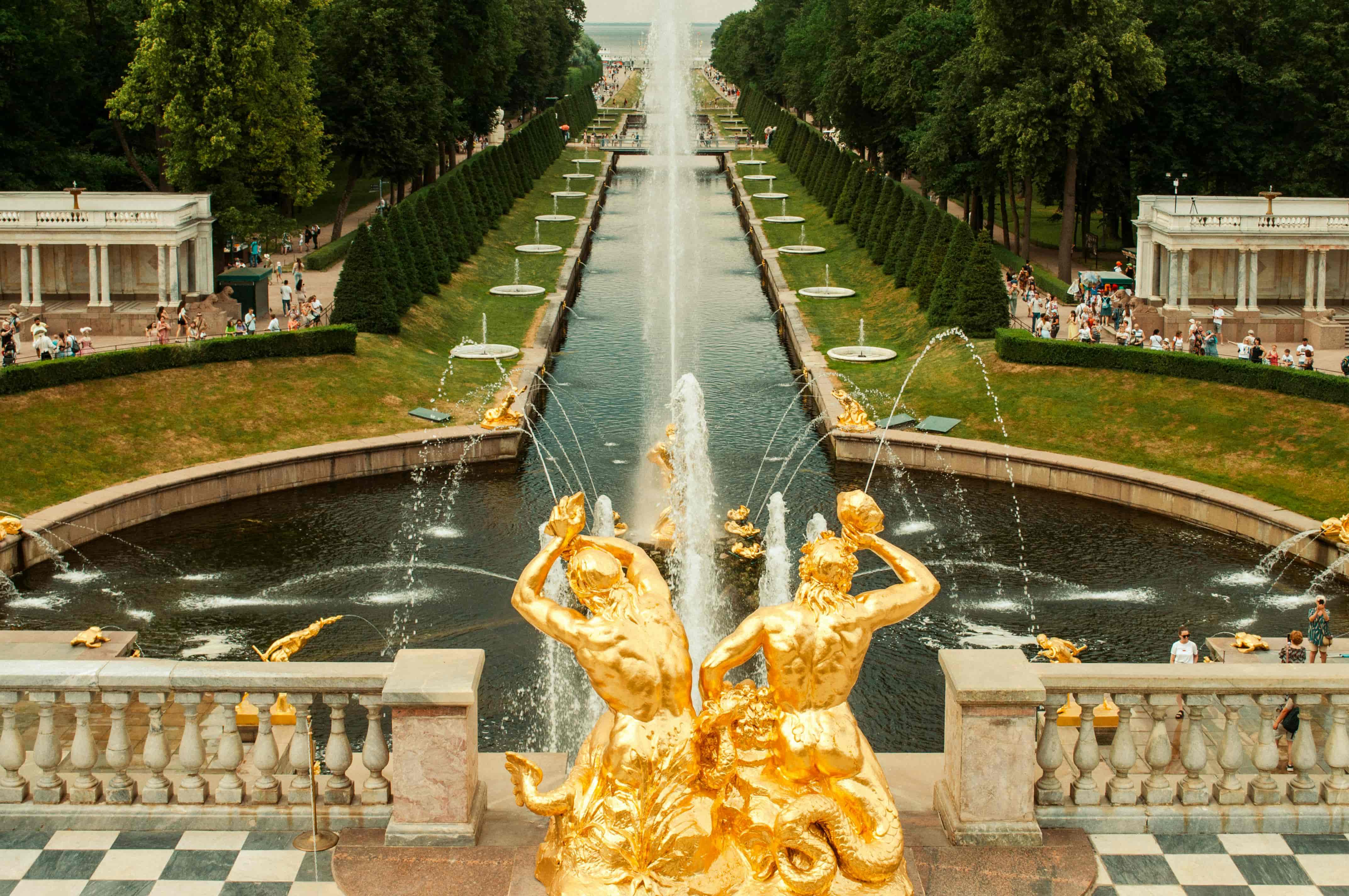 Парадная загородная часть программы с фонтанами и прогулочной атмосферой.